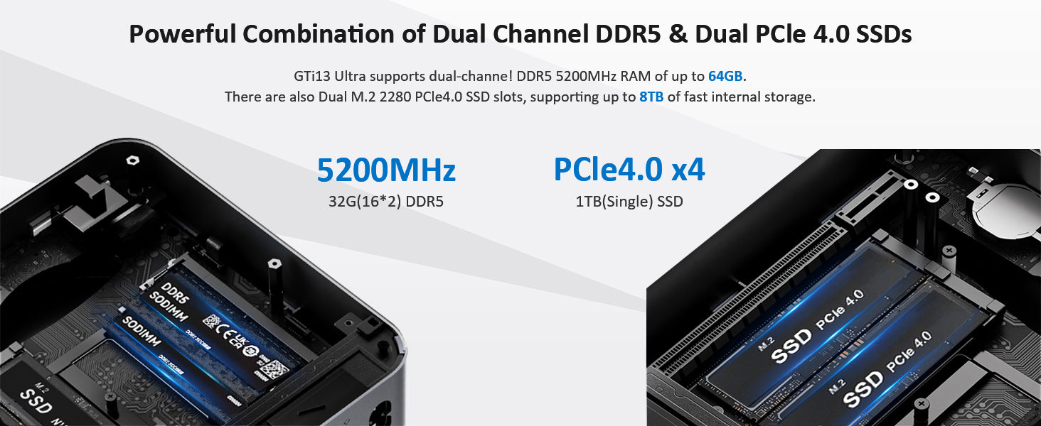 Experience next-level performance packed into a sleek, compact powerhouse. The Beelink GTi13 Ultra, powered by Intel Core i9-13900HK, is engineered for creators, coders, and professionals who demand speed without compromise. Whether you're editing 4K video, running AI models, or multitasking across triple screens, this mini PC is your silent partner in serious productivity. Innovation meets elegance—unlock limitless possibilities with the GTi13 Ultra.