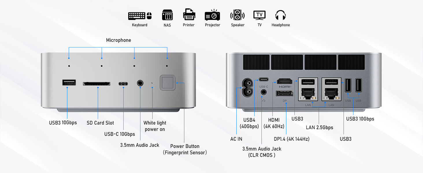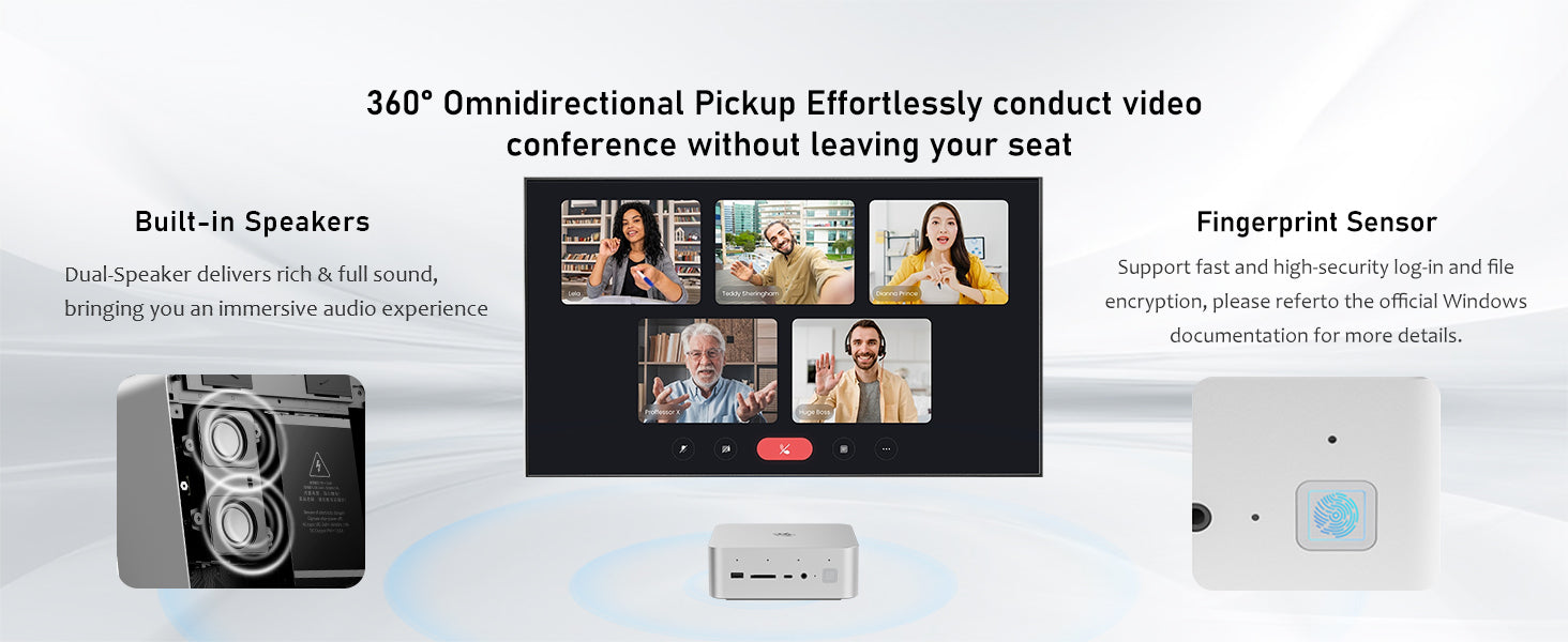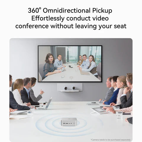 On the i9-powered Beelink mini PC, a dedicated AI audio chip drives a built-in microphone array that uses real-time noise reduction and beam-forming to capture your voice from any direction up to about five meters away, filtering out background noise so you can speak naturally anywhere around the device and get a clear, uninterrupted audio stream for calls, voice assistants or AI apps.